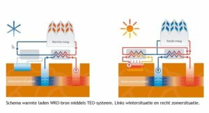 Nu gaan we in op de meest toegepaste vorm van TEO, namelijk TEO in combinatie met een bodemenergiesysteem. Met het TEO-systeem wordt er warmte of koude gewonnen uit het oppervlaktewater en deze wordt middels een bodemenergiesysteem ondergronds opgeslagen in de Warmte-Koude Opslag-bronnen (WKO-bronnen). Het bodemenergiesysteem dient hierbij als seizoensbuffer. De opgeslagen warmte of koude wordt dan in de winter voor verwarming en in de zomer voor koeling gebruikt van bijvoorbeeld woningen. Naast seizoensopslag wordt TEO, vergelijkbaar met een droge koeler, vaak ook ingezet als regeneratie voor de bodemenergiebalans. Het is namelijk wettelijk verplicht om te zorgen voor een goede energiebalans in de bodem.